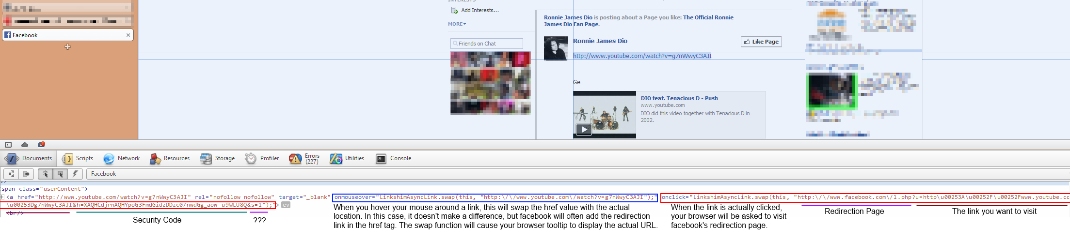 Since the only way for facebook to ensure that it knows which websites you click is to format every external link to look like the url in the address bar in the screenshot, it must change the actual location of the link you share. But if it does that, a user would know where a URL is really pointing to simply by hovering your mouse over a link and looking at your browser tooltip for the actual location of the link. "For your convenience", facebook adds the following event handlers for every external link that you post on facebook. Click the thumbnail too see the details.